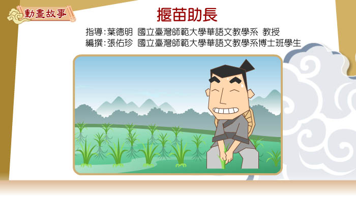 古代有一個農夫,總覺得他田裡的秧苗長得太慢,工作起來實在沒有意思。有一天,農夫忽然有個主意,他心想:「每天只要將秧苗拔高一點兒,我不用等到秋天,就能夠收割稻子了。」 他越想越得意,就到田裡把每棵秧苗向上拔高了一點兒,不用一會兒的工夫,全部的秧苗都被他拔得高高的了。 農夫回家以後,很驕傲地對家人說:「好累喔!因為我今天很努力地幫秧苗長高了呢!」 農夫的兒子聽到了,嚇了一大跳,他匆匆地跑到田裡一看,發現所有的秧苗全部枯萎了。