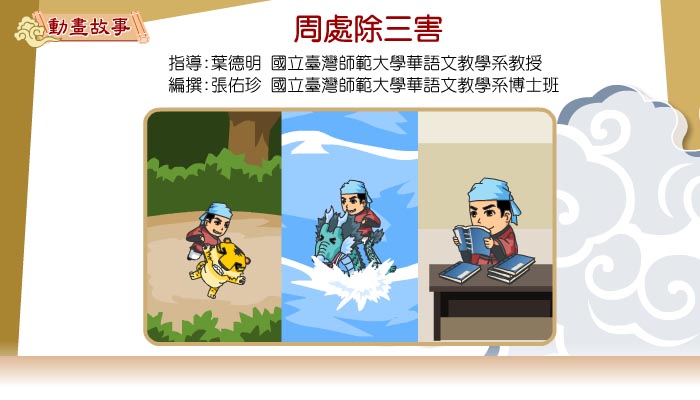 古代有一個名叫周處的人,從小就不愛讀書,喜歡仗著自己力氣大,專門欺負弱小,全村的人都討厭他。 在周處的家鄉附近,山上有一隻大老虎,江裡則有一條大蛟龍,常常出來傷害人們,讓大家非常害怕。所以村子裡的人把大老虎、大蛟龍和周處合稱「三害」。其中,周處是三害裡最令人討厭的。有一天,周處在街上看到每個人臉上都沒有笑容,他好奇地問一位老人:「今年的收成應該不錯,為什麼大家一點兒也不開心?」老人搖搖頭說:「我們這兒有三害,怎麼會笑得出來?」 周處問:「什麼是三害?」老人告訴他:「大老虎、大蛟龍,再加上你,不就是三害嗎?」周處聽後臉都紅了,沒想到自己竟然是別人眼中的壞東西。他下定決心要重新做人,於是上山殺老虎,下水殺蛟龍,接著向老師學習,努力讀書,修養自己。最後周處成為國家重要的人才,他終於為全村的人除掉了三害了。